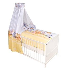 Dieses Set beinhaltet ein mit Polyestervlies gefülltes Nestchen mit Bindebändern, eine Kinderbettwäsche (100/135 cm und 40/60 cm) aus reiner Baumwolle und einen passenden Himmel mit genähtem Tunnelzug und bedrucktem Himmelband. Diese textile Ausstattung besteht aus zwei aufeinander abgestimmten Baumwollstoffen, die bis 60°C gewaschen werden können, Trockner geeignet sind und außerdem auf gesundheitliche Unbedenklichkeit nach Öko-Tex Standard 100 geprüft sind.